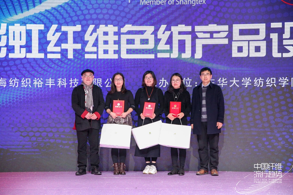 颁奖仪式上,与会嘉宾代表上海裕丰纺织科技有限公司总经理赵培、博拉经纬纤维有限公司总经理朱永军、ok138太阳集团中国官方网站教授薛文良为获得大赛入围奖的学生颁发了荣誉证书和奖品,并合影留念。