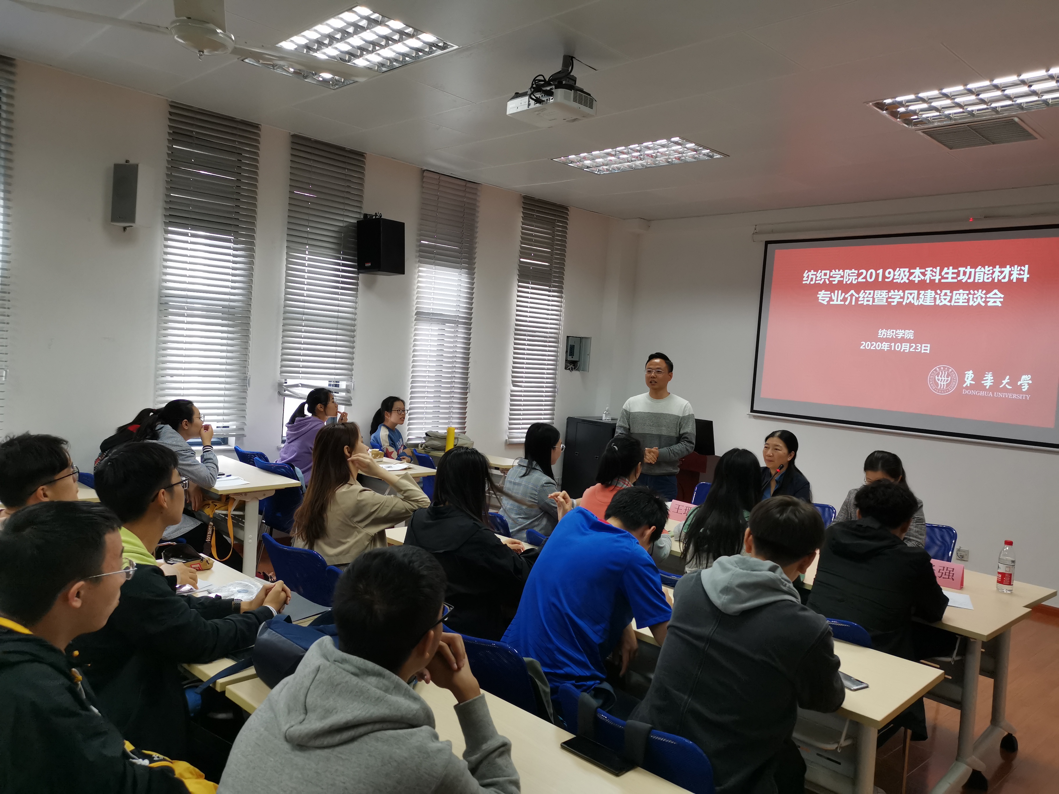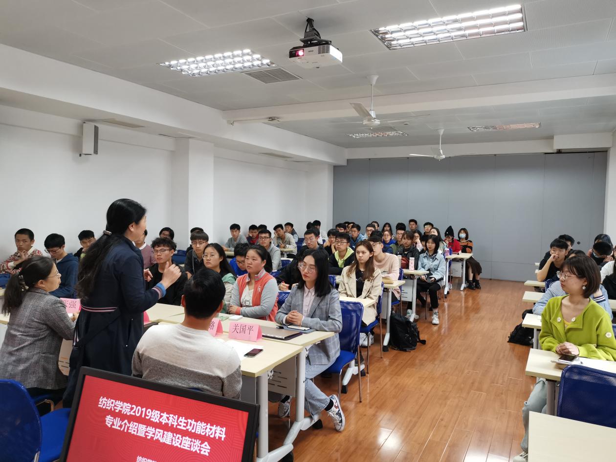在功能材料专业介绍暨学风建设座谈会中,王璐老师作为功能材料专业的发起人和学科负责人,她详细介绍了功能材料专业的创建背景、重要意义和发展概况,她从“做什么”、“干什么”和“有哪些成就”三个方面阐述这一新兴学科的发展和取得的成就,勉励大家要增强专业认知,坚定目标方向,提升专业自信。高技术纺织品系教学主任高晶老师从课程安排和教学管理两个方面介绍功能材料专业的人才培养情况,她强调了理论与实践结合的重要性,并对大家今后几年的专业具体学习提供了建议。2019级功能材料专业班主任关国平老师结合个人经历给学生科研学习和课外科技活动提出了一定的见解和看法,同时他指出“科研并不是遥不可及的”,建议大家要尽早接触并提前进入状态。